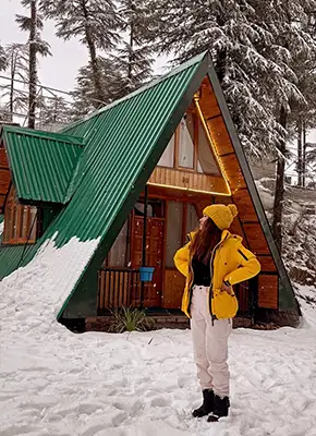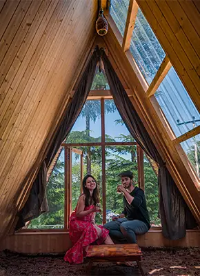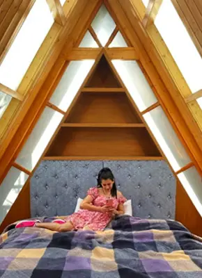 Set amid quiet pine trees on the National Highway 22, the Alpine Woods features three A-frame cottages with warm wooden interiors and ample space for families & groups.